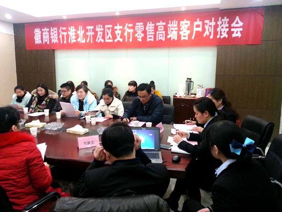 2015116下午,徽商銀行零售高端客戶對接會在徽商銀行淮北開發區支行會議室召開。鼎盛國際購物中心財務信息部、麒麟卡部、客服中心等部門人員應邀參加了對接會。