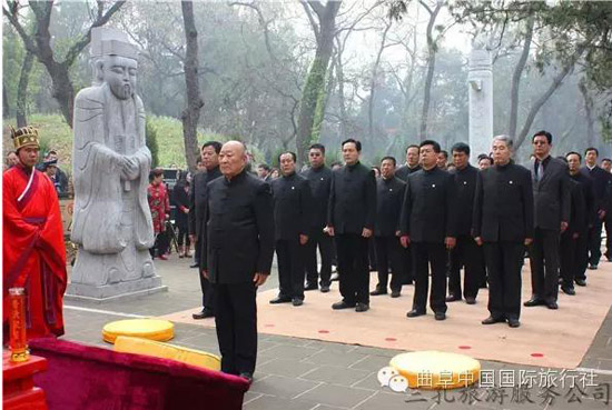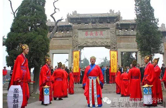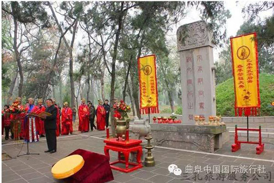 按照曲阜當地的風俗,在每年的清明節,孔子后裔都要到孔氏的家族墓地孔林掃墓,祭拜先祖。浩浩蕩蕩的掃墓隊伍,就是一幅幅活生生的民俗畫,最生動地體現著中華民族古老的文化。清明節孔子后裔祭祖釋奠儀式,是三孔旅游服務公司根據《曲阜縣志》、《圣門禮志》、《闕里志》等有關記載,以歷史文化為根基,以對傳統清明節祭祀孔子相關儀式的生動再現為手段,推出的盛大祭祀活動,從而把印在塵封古籍中的古老風俗,刻在千年石碑上的儒家文化,生動地展現在人們的面前。