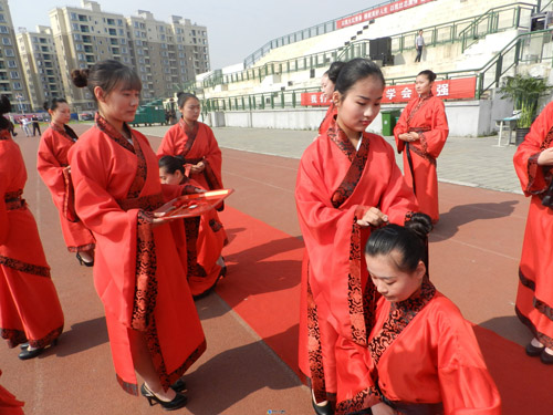 禮文化是華夏文化的核心,冠禮和笄禮是一個新的成人第一次踐行華夏禮儀, 也是冠者進入華夏禮儀系統的起始。所謂"冠者禮之始也",淮北市天一中學繼承并發揚這一優良傳統,堅持從“品”樹人,從“學”育人。自20106月至今,據不完全統計,已有5000多名學生接受天一中學成人儀式,成為頂天立地的成人。