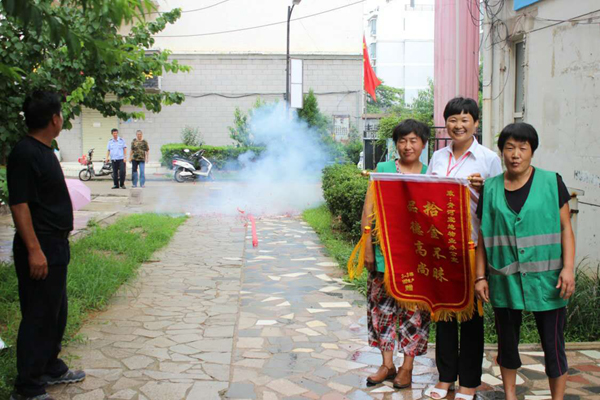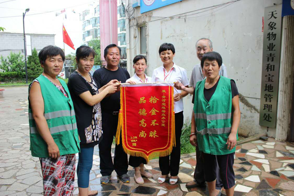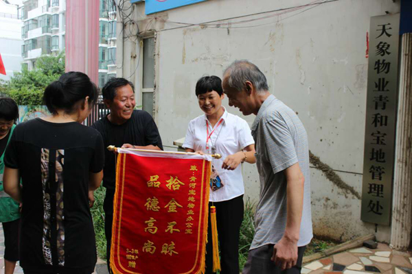 82日,淮北天象物業管理公司保潔員祝道俠和任翠萍像往常一樣在清理小區垃圾時,撿到一個皮包,打開一看里面裝有一萬多元,她們意識到這包應該是業主不小心遺失的,于是趕緊向物業公司領導匯報,希望可以及時聯系上業主。物業公司立即通過走訪詢問找到了失主,失主喜極于泣,感激萬分!事后,業主將一面寫有“拾金不昧,品德高尚”八個大字的錦旗、水和糖送到了小區物業管理處,還燃放了兩掛鞭炮,對祝道俠和任翠萍兩名同志拾金不昧的義舉表示感謝。