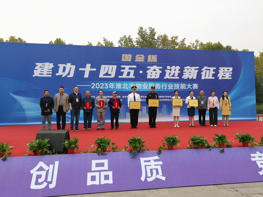 為弘揚勞動精神、工匠精神,展示物業工作者的專業風采和精神風貌。20231019日上午,2023年淮北市物業服務行業技能大賽在市體育場隆重舉行,天象物業代表隊一行14人參加了活動賽事,經過多日的苦訓備戰,天象物業公司在參加的三個比賽項目中,兩項獲獎,維修組榮獲二等獎、秩序組榮獲三等獎,天象物業公司榮獲優秀組織獎。